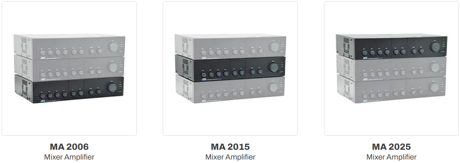Dòng MA 2000 là dãy bộ trộn khuếch đại (Mixer Amplifiers) có thể xử lý 4 đầu vào micrô và đầu vào phụ, giúp Dòng MA 2000 phù hợp với các ứng dụng địa chỉ công cộng quy mô vừa và nhỏ, chẳng hạn như nhà thờ Hồi giáo, văn phòng, nhà hàng hoặc quán rượu, câu lạc bộ thể dục, khán phòng, nhà kho, nhà máy và cửa hàng bán lẻ. Dòng MA 2000 đi kèm với các điều khiển tăng đầu vào riêng lẻ với điều khiển âm lượng chính. Các điều khiển Bass và Treble được cung cấp để người dùng tùy chọn cân bằng. Dòng MA 2000 được tích hợp chức năng tắt tiếng giọng nói cho Mic 1, do đó ưu tiên cao nhất để ghi đè các nguồn khác trong trường hợp khẩn cấp. Có thể hoạt động bằng nguồn điện chính hoặc pin ngoài, Dòng MA 2000 là giải pháp khả thi cho bất kỳ ứng dụng di động nào, từ sự kiện thể thao trong ngày của gia đình đến tiệc ngoài vườn quy mô lớn.