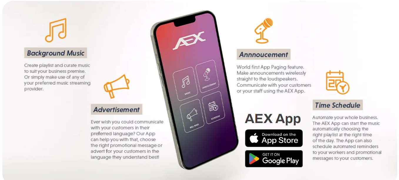 Một giải pháp truyền thông để nâng cao doanh nghiệp của bạn. Thông báo lịch trình và lời nhắc, kiểm soát nhạc nền và đưa ra thông báo đến cơ sở kinh doanh của bạn. Ứng dụng AEX được thiết kế để trở thành giải pháp truyền thông khi sử dụng với toàn bộ bộ thiết bị AEX System. Ứng dụng này được thiết kế để giúp chủ doanh nghiệp bán lẻ cải thiện doanh nghiệp của họ và tăng doanh số bằng cách thúc đẩy mua hàng theo ý muốn thông qua quảng cáo chính xác. Ứng dụng cũng có thể cải thiện hoạt động của văn phòng và nhà máy thông qua lời nhắc theo lịch trình cho nhân viên.